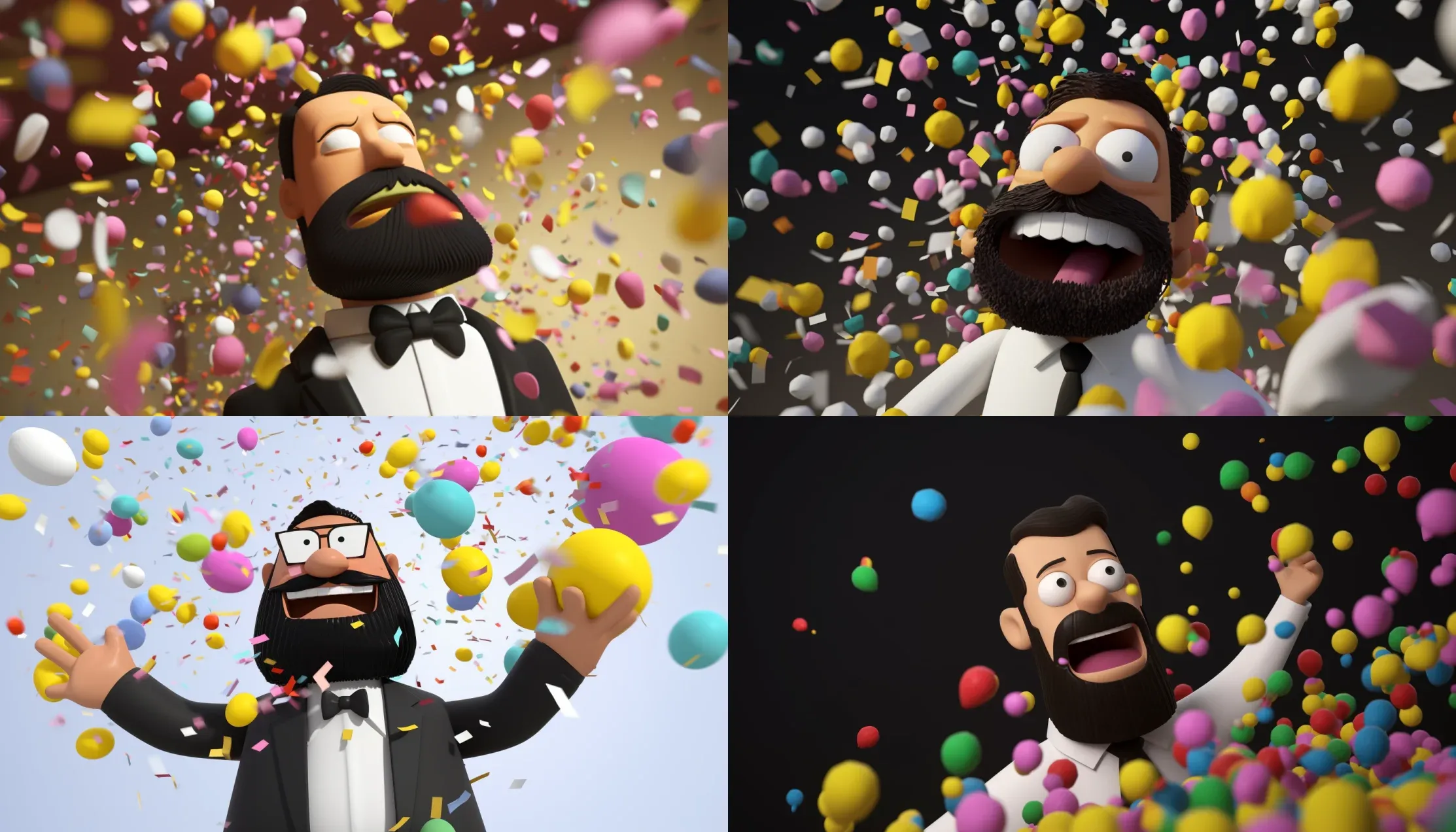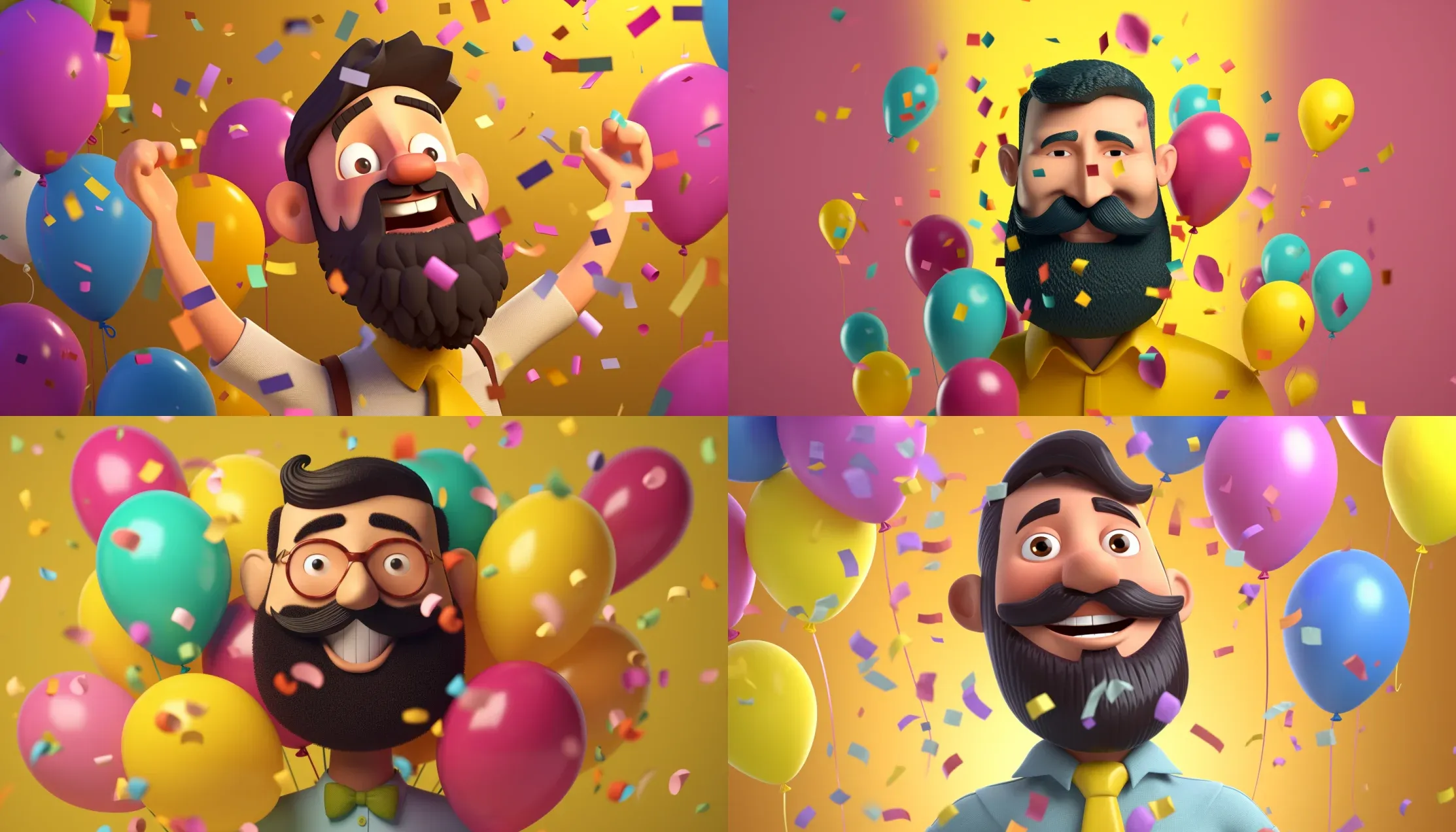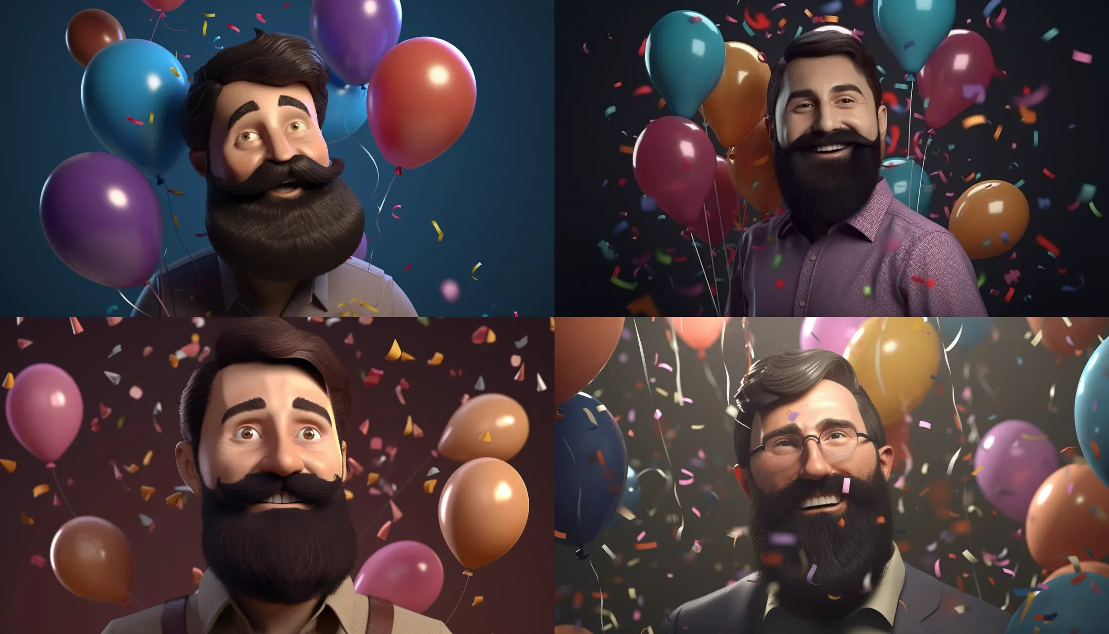 happy man with dark brown beard and mustache, celebrating work anniversary, balloons, confetti, digital art, 3D, --v 5 --ar 7:4