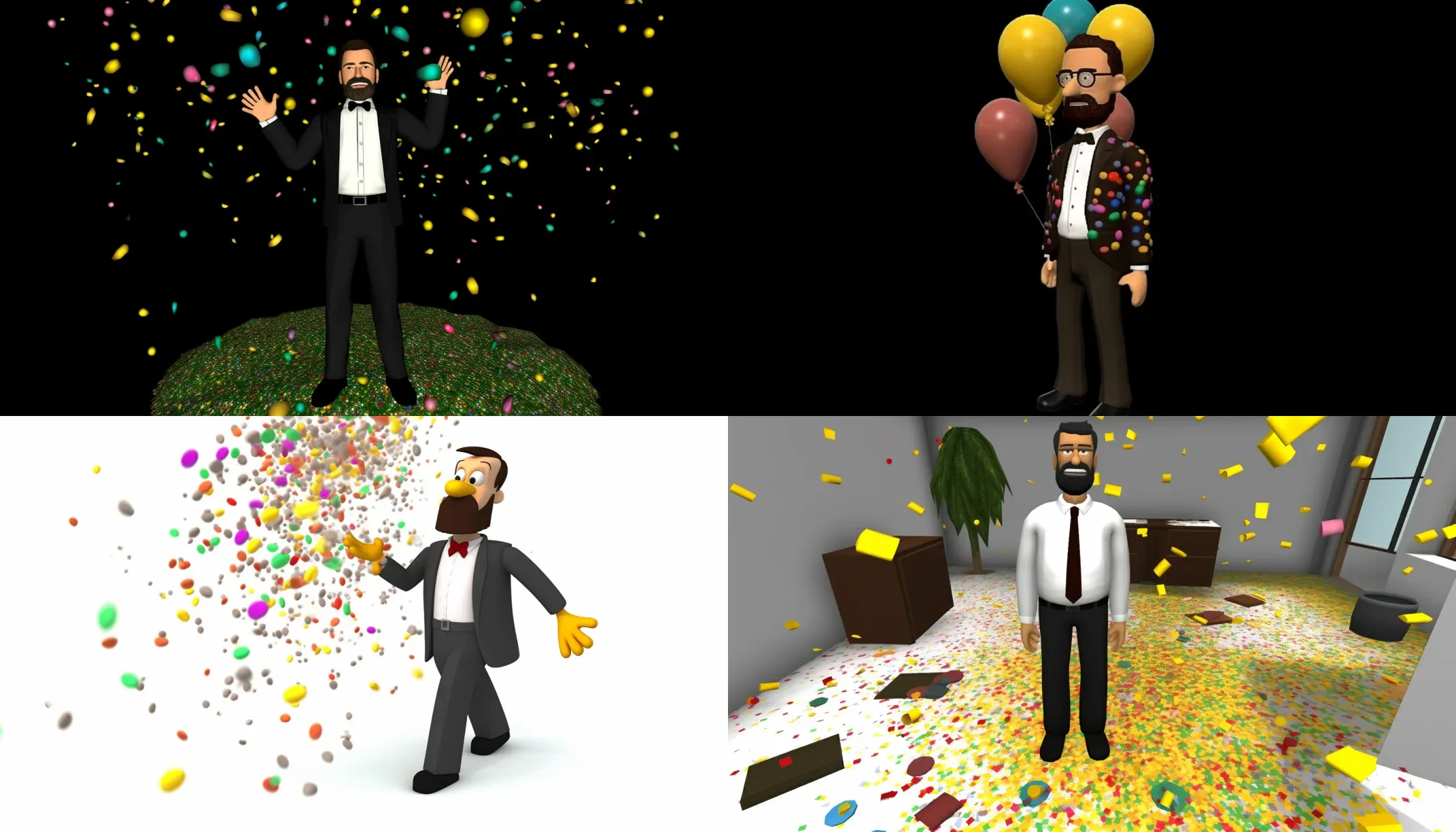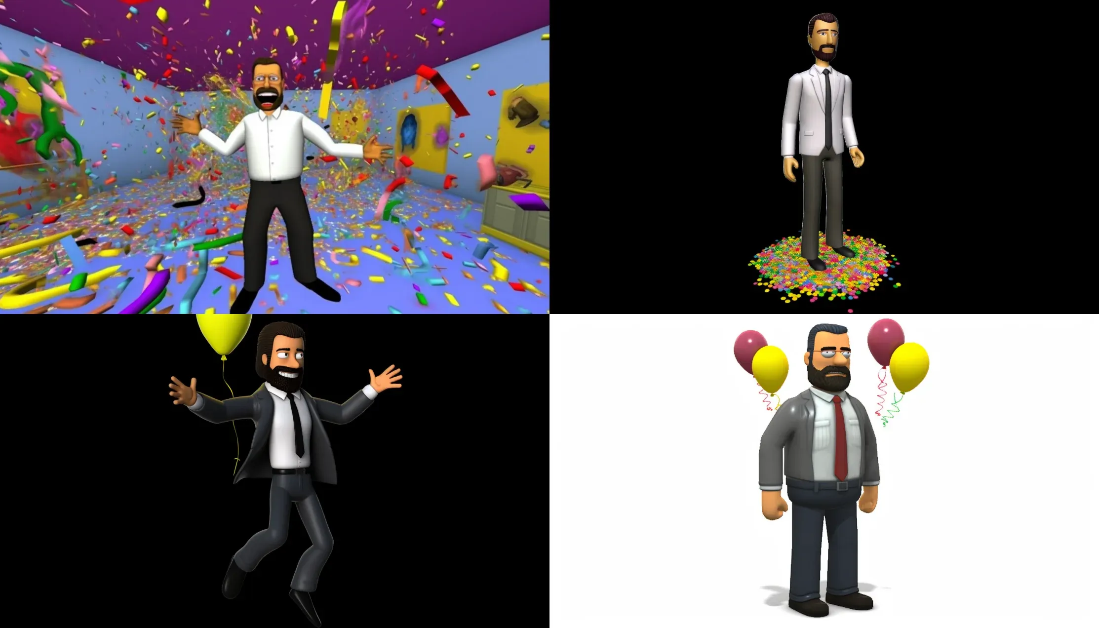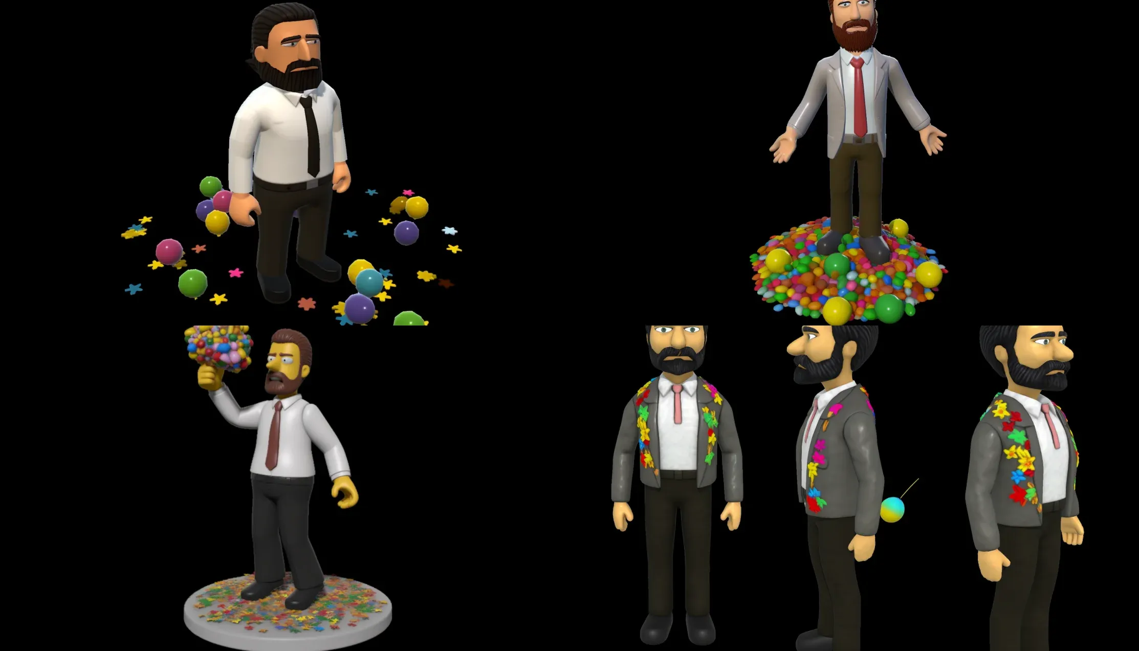 We decided to play with the idea of a 3D character that looks more like Michael, keeping the balloons and confetti.