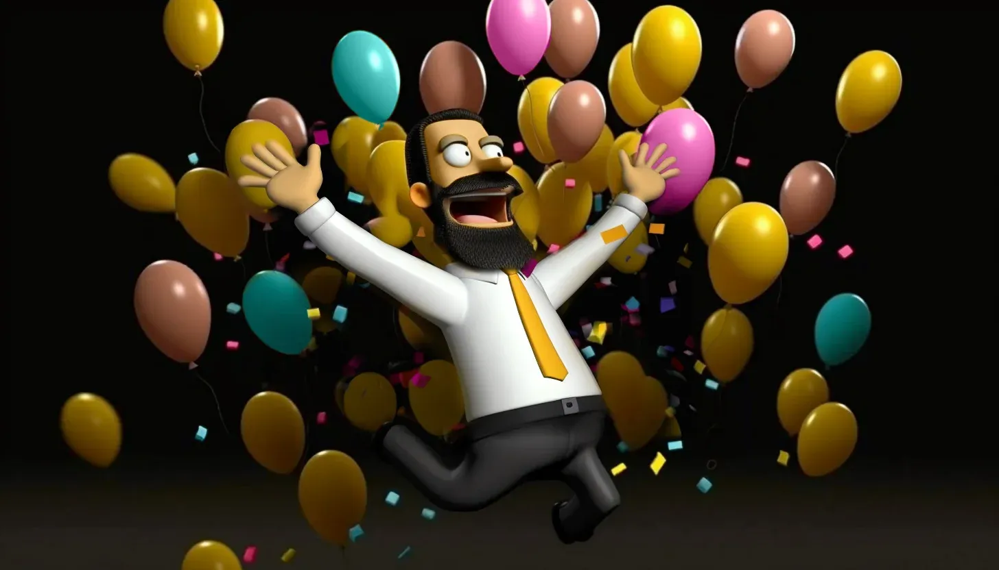 happy man with dark brown beard and mustache, celebrating work anniversary, balloons, confetti, digital art, 3D, in style of a Simpsons character, --v 5 --ar 7:4